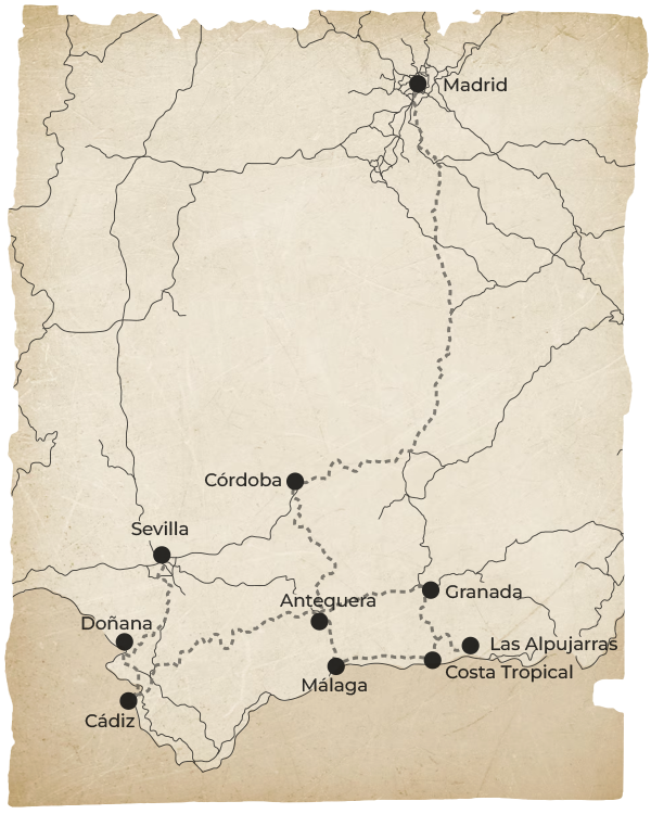 Desde las Alpujarras, con sus pueblos blancos y terrazas de montaña, la ruta desciende hacia la Costa Tropical y Málaga, combinando mar y patrimonio. El recorrido continúa hacia Cádiz, Jerez y Doñana, antes de cerrar en Sevilla, ciudad vibrante y monumental.