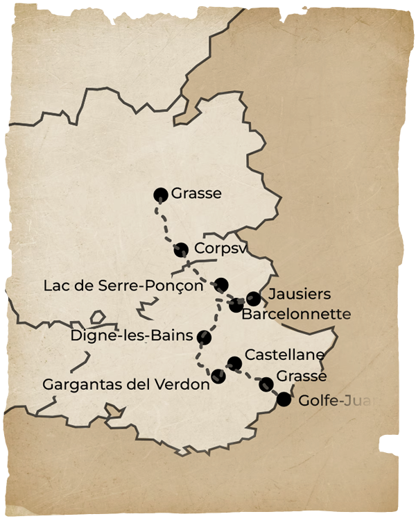 Una ruta en autocaravana que atraviesa el sur de Francia desde Golfe-Juan hasta Grenoble, siguiendo el histórico recorrido de Napoleón en 1815 tras su regreso de la isla de Elba. Un viaje entre costa, Alpes y pueblos de montaña donde historia y paisaje avanzan juntos.